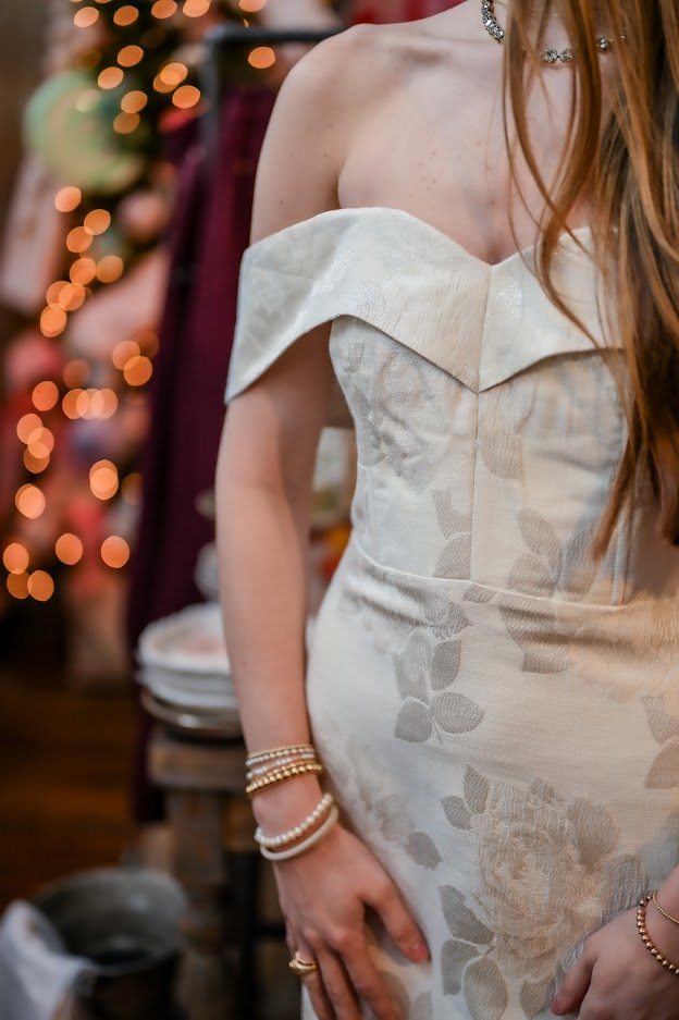 The design highlights the shoulders with a feminine off-shoulder neckline and a tailored bodice. The dress features a gentle fit-and-flare silhouette that ends at a flirtatious mini length. The combination of the classic color and structured texture creates a timeless and elegant party dress.
